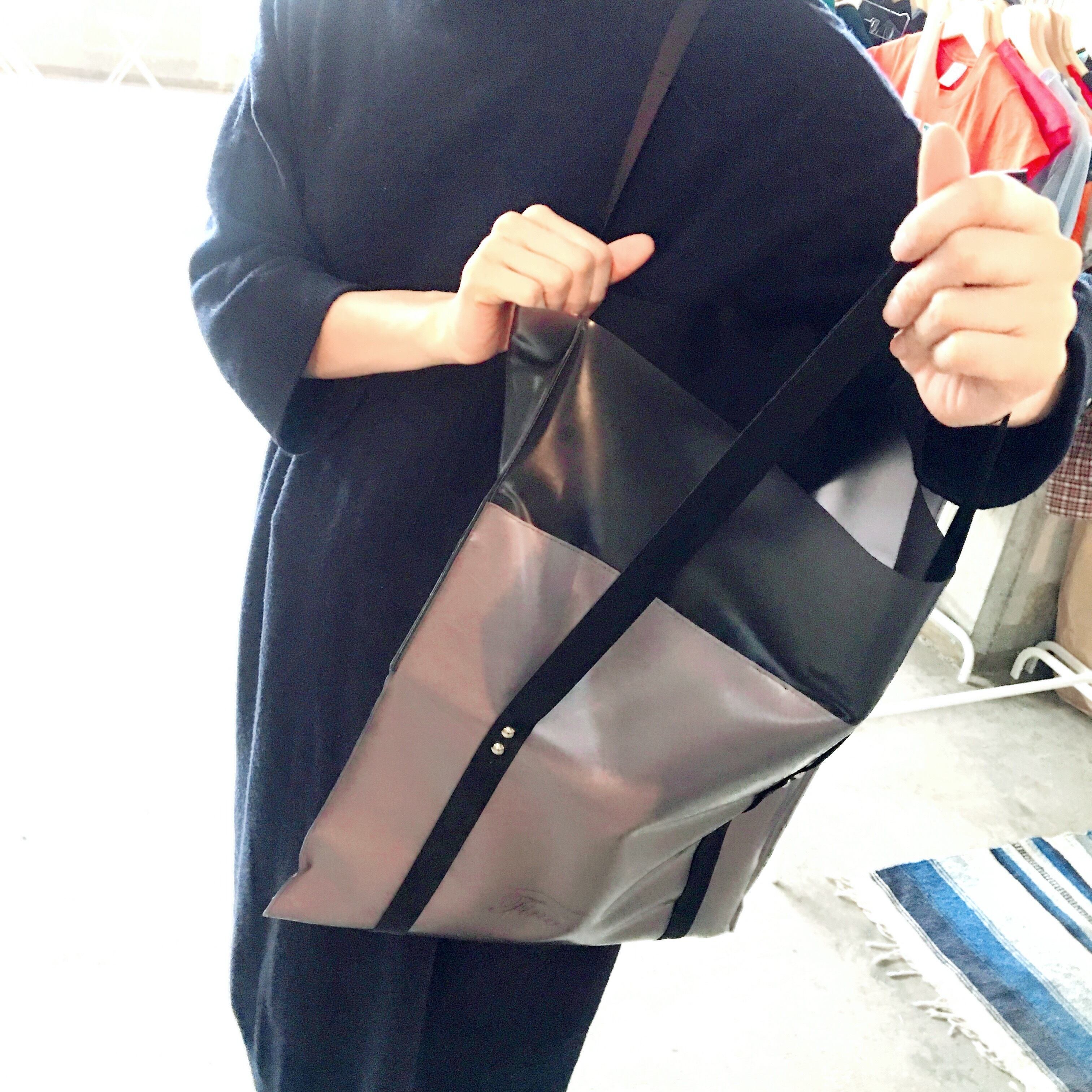 スクエアバッグはマチ無しですがたくさんの荷物が入り、中の上部に大きなポケットを付けているので荷物を整理して持つことができます。